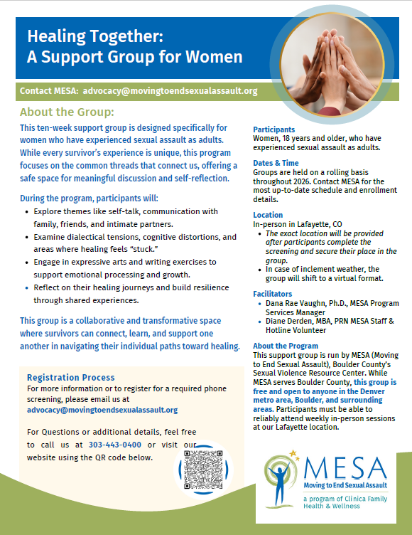 MESA is pleased to announce that our next Healing Together Support Group for women will begin in January 2026. This will be a 10-week, in-person program designed specifically for adult women who experienced sexual assault as adults. Participants must be at least 18 years of age.